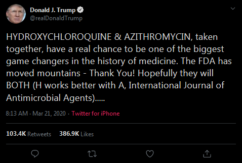 Un trino del mismo que salió con la perla de la inyección de desinfectante.... JAJAJAJAJA, Trump no dejará de ser el payaso que es, a ver... ¿si es tan buena esa droga por qué están cayendo como moscas en Nueva York? ¿Se están muriendo de la risa con todas las barbaridades que dice ese señor? Por favor, sígueme haciendo reír Spiderman, me haces el día, JAJAJAJAJA...