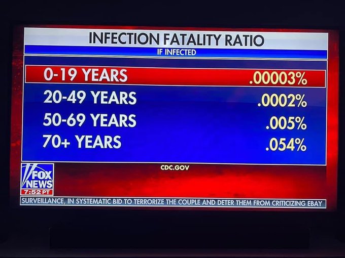 ¿Estan seguros de que el mal que afecta al mundo en la actualidad es una "Pandemia"? A juzgar por los datos y las tasas de mortalidad si quedas infectado por corona NO hablamos de una "pandemia". ¿A QUIENES conviene promover la idea de una "pandemia" y exagerar las cifras? Juzguen ustedes, captura de pantalla de tabla comparativa en Fox News y más abajo trino de periodista de la misma cadena de noticias....