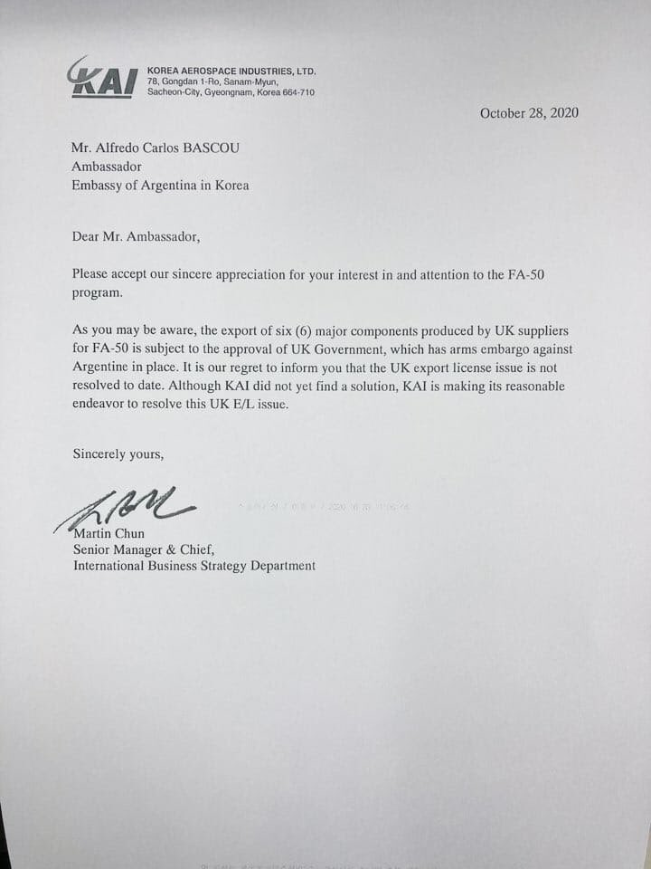 que el KAI T-50 se aleja de Argentina. La empresa ha dirigido una carta