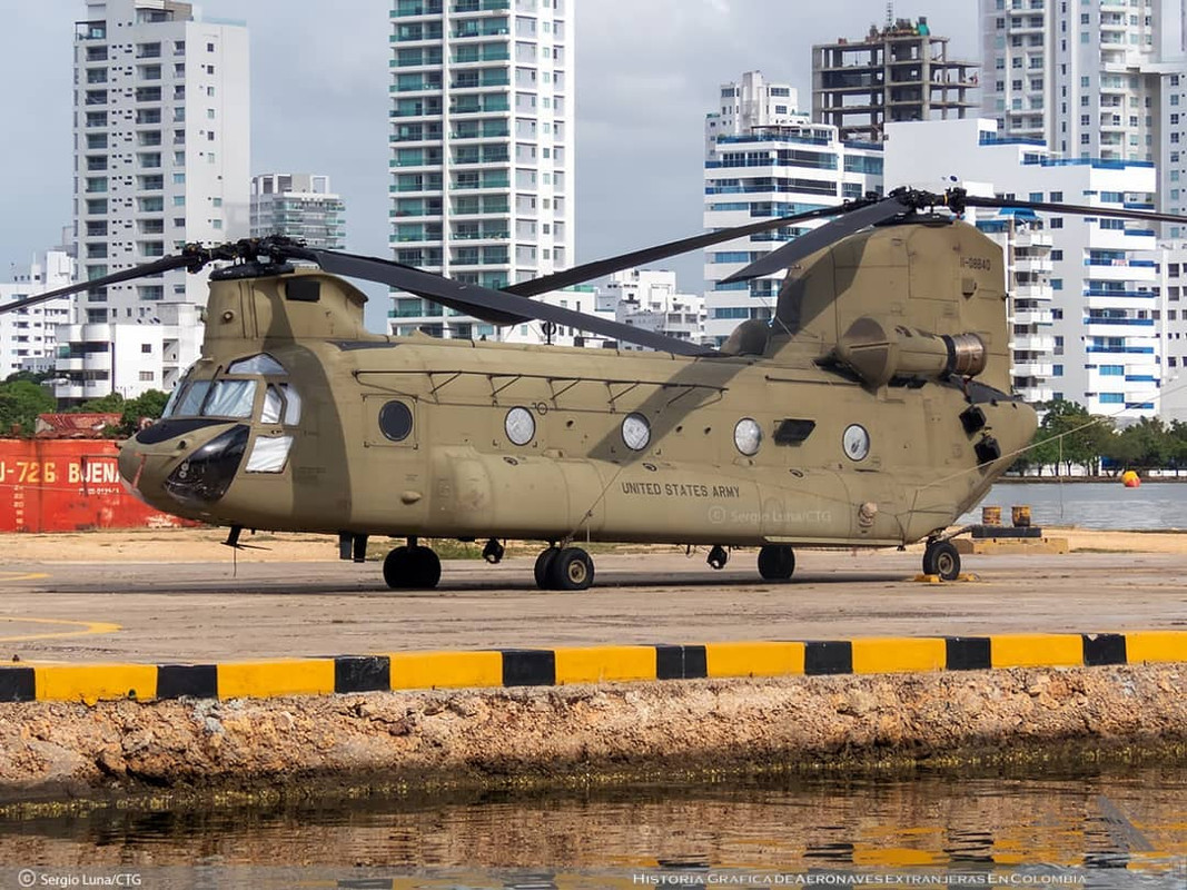Helicóptero tipo CH-47 Chinook, en la base naval ARC Bolívar y "En apoyo a la jornada "Promesa Duradera" con el buque Comfort que estuvo en Turbo y está ahora en Ríohacha."
