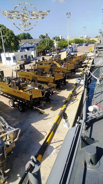 Los nuevos botes de Cotecmar para operaciones de la INFAMAR en aguas someras. Tienen varias diferencias con las Pirañas tradicionales, la mas notoria unas planchas para protejer los motores.