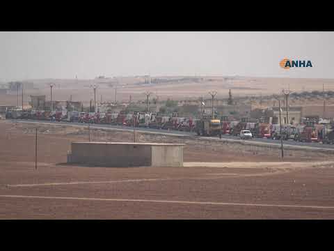 Evacuación de la base militar de los Estados Unidos "el Galb" en el Kurdistán sirio. Gringo incendió el campamento antes de la evacuación. Se quema en el horizonte. 0:00-0:09