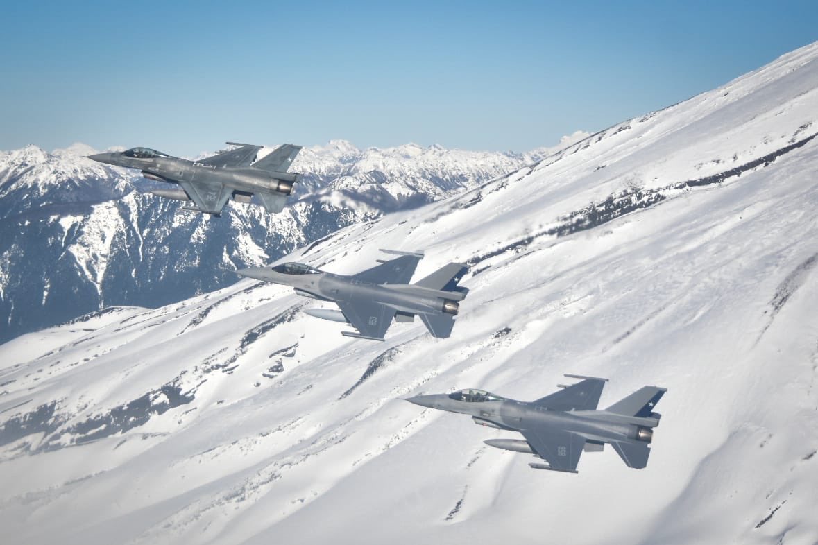 Cazabombarderos F-16 Fighting Falcon de la FACh sobre la cordillera de Los Andes. Imagen: FACh
