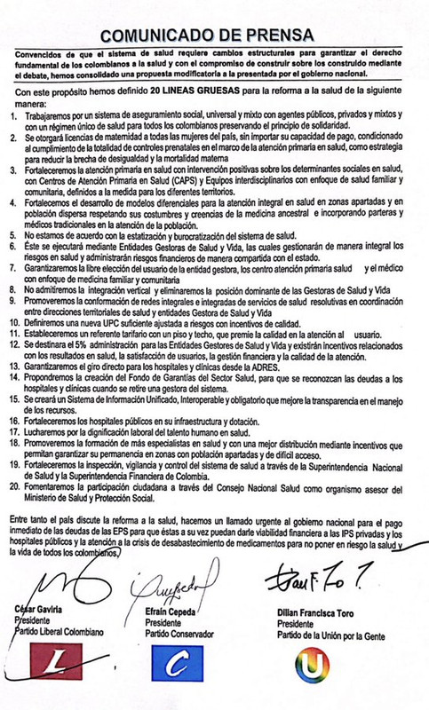 El documento de la contra reforma a la salud de los Liberales, Conservadores y La U consta de 20 puntos y la van a radicar mañana ante el presidente de la cámara de representantes y luego se la van a enviar a Petro