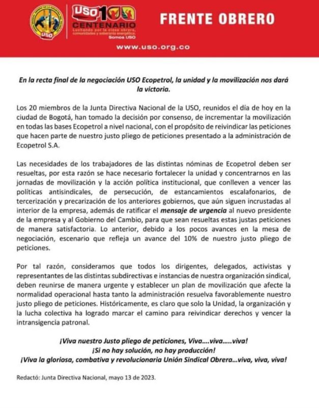 El sindicato vendido de Ecopetrol piensa entrar en paro de actividades y saben porque, ellos apoyan fervientemente la "transición energética" de Irene Vélez lo cual llevará a la destrucción de la empresa y la economía del país