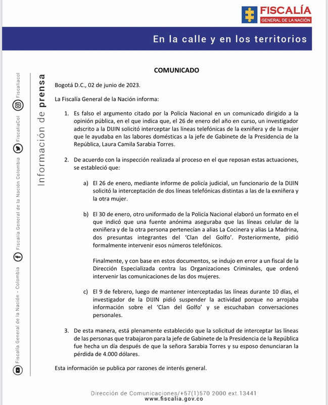 Atentos: La @FiscaliaCol desmiente a la @PoliciaColombia y dice que no es cierto que se haya solicitado la interceptación de los teléfonos de las dos empleadas de @laurisarabia el 26 de enero. Fiscalía denuncia que el fiscal que investigaba un caso contra el Clan del Golfo fue inducido a error para escuchar a las dos mujeres. Vía @UltimaHoraBLU@BluRadioCo