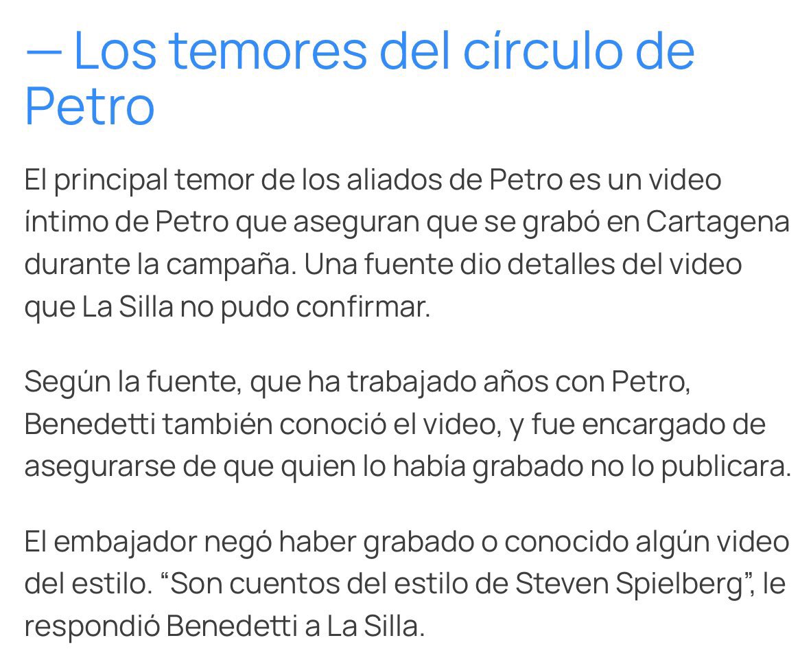“El principal temor de los aliados de Petro es un video íntimo de Petro que aseguran que se grabó en Cartagena durante la campaña”.