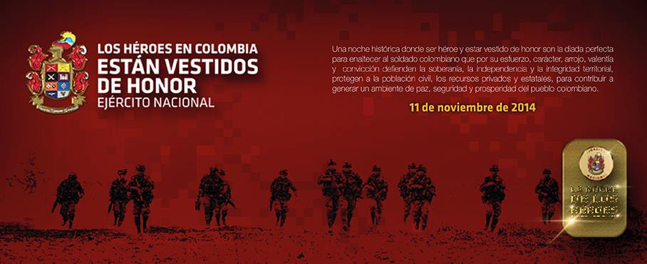 Bogotá. En una ceremonia de gala denominada La Noche de los Héroes, este martes 11 noviembre el Ejército Nacional hará un reconocimiento a los hombres y mujeres de la Fuerza que se han destacado en diferentes áreas y que han demostrado día a día su compromiso con la Institución durante el año 2014, asimismo se realizará el lanzamiento de la campaña institucional Los Héroes de Colombia están Vestidos de Honor.