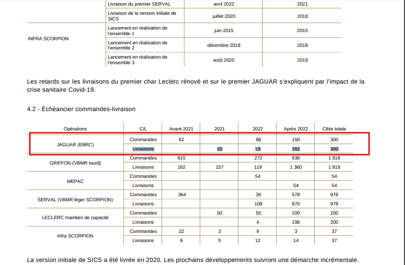 Y como se puede leer en la segunda imagen- sino tiene traductor pida el favor que cualquiera le traduce- la meta en el 2022 era de 150 Jaguar y por temas de COVID -19 no se pudo, pero el Jaguar al igual que todos los vehículos del proyecto Scorpion están en producción porque el gobierno francés ya aprobó los recursos ..... no pasa lo mismo con el tema de los blindados rusos y el gobierno de Putin