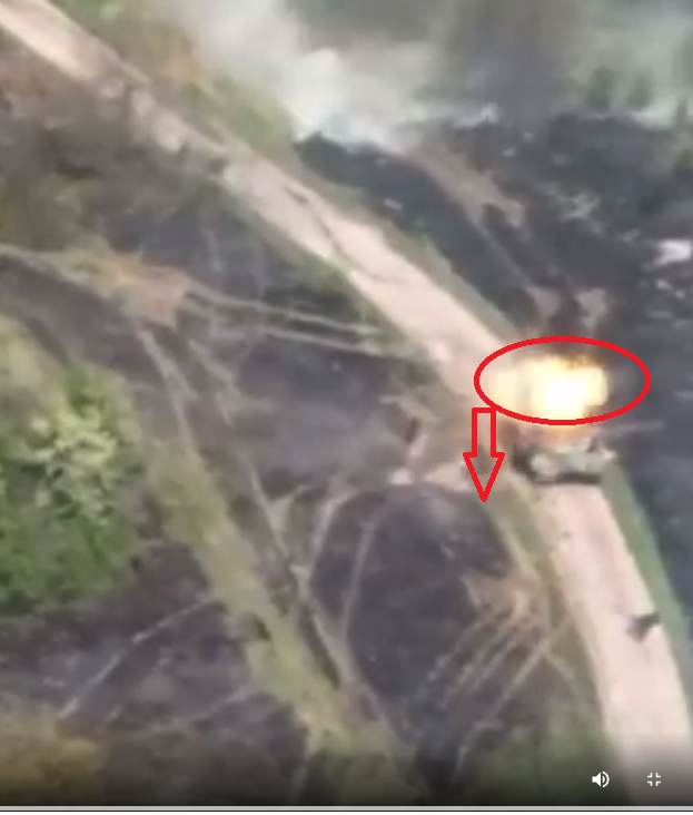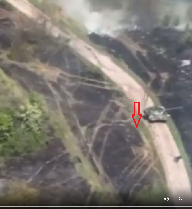 En esta primera captura observamos la dirección en la cual se desplaza el tanque T-90M en cuestión, la flecha indica de popa a proa.. Esta segunda captura muestra el fogonazo del impacto, evidentemente en la parte trasera del vehículo la flecha continua indicando la dirección de la proa... En los siguientes cuadros se observa el daño considerado a la zona del motor evidente punto de impacto... Al observar los foto gramas del tanque destruido, se nota que la zona con más daños es la parte trasera del tanque, donde va el motor y la transmisión, da la impresión de que esta fue la zona alcanzada, hay que recordar que entre las zonas menos protegidas de un tanque están la parte trasera y la parte superior de la torre. Ahora una pregunta que deberían hacerse los que defienden la teoría del Carl Gustav cual es el ángulo de ataque de la munición de este RPG?? por que pareciera que la munición ataco desde arriba.!!