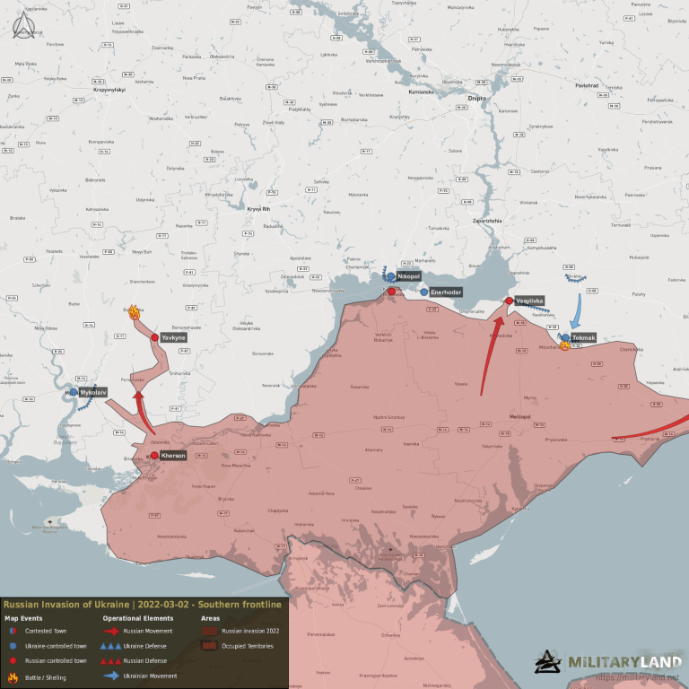 Las fuerzas rusas capturaron Kamianska-Dniprovska y Vasylivka. Las fuerzas ucranianas volaron ayer un puente ferroviario en Vasylivka, lo que complica el avance ruso hacia el norte. La fuerza local de autodefensa ucraniana protege Enerhodar, pero no hay presencia militar y están rodeados.