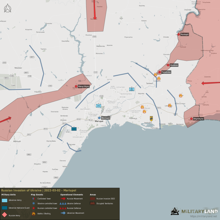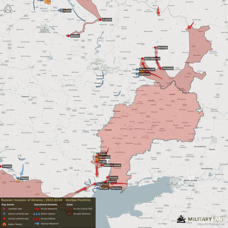 Las tropas rusas avanzaron dentro de Volnovakha y capturaron la mayor parte de la ciudad. Según fuentes ucranianas, Volnovakha está casi completamente destruida. Las fuerzas ucranianas perdieron un BMP-1 y al menos un tanque durante la batalla.