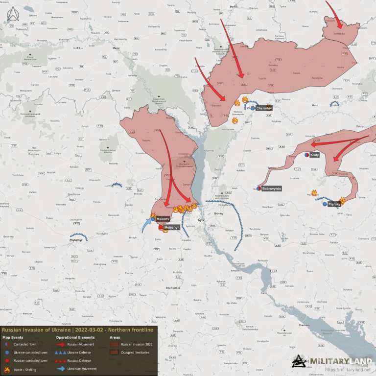 Las fuerzas ucranianas tendieron una emboscada a un convoy enemigo cerca de Kruty y destruyeron varios vehículos. Las fuerzas rusas afirman que llegaron a las afueras de Brovary, pero no podemos confirmarlo.