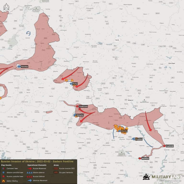 Les dejo unos mapas muy interesantes de https://militaryland.net/ukraine/invasion-day-7-summary/