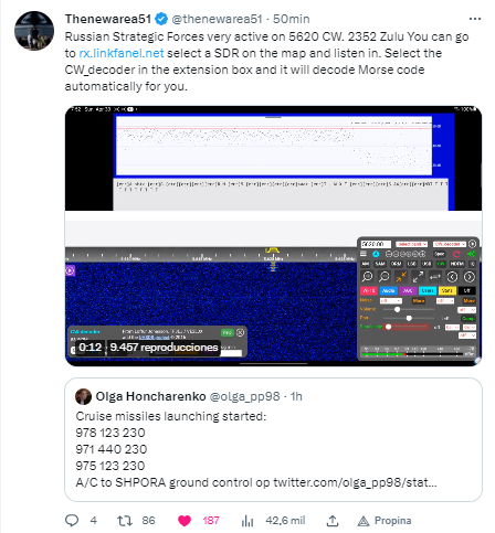 Desde más o menos las 5-6 de la tarde andaba viendo rumores de oleada de misiles rusos. Primero porque los mismos rusos que viven cerca de la base de Engels estaban reportando despegue de varios bombarderos Tu. Luego, la famosa Bear Net, estaciones de radio HF donde transmiten los bombarderos rusos empiezan a transmitir y los radioaficionados pueden oír los "pings" de código morse que se empiezan a mandan por ahí.