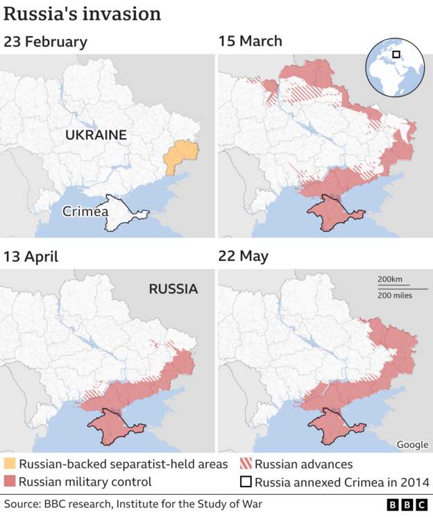 A ver. Para empezar, Crimea se la robaron en 2014, lo rojo en el Este corresponde a Donetsk y Luhanks, que supuestamente son territorio pro-rusos, donde habita la mayoría de habitantes de dicho origen en Ucrania, así que era claro que en una guerra abierta estarían del lado ruso. La parte sur de Ucrania contra el Mar de Azov y el Mar Negro es lo que se puede disputar, ya que es territorio ucraniano en sí, y, repito, para lo que buscaba Rusia no es el gran avance, es más, de ahí tendrá que salir por la buena o por la mala, y si es por la mala, no duden que Ucrania irá de una vez por Crimea y los territorios del Donbass.