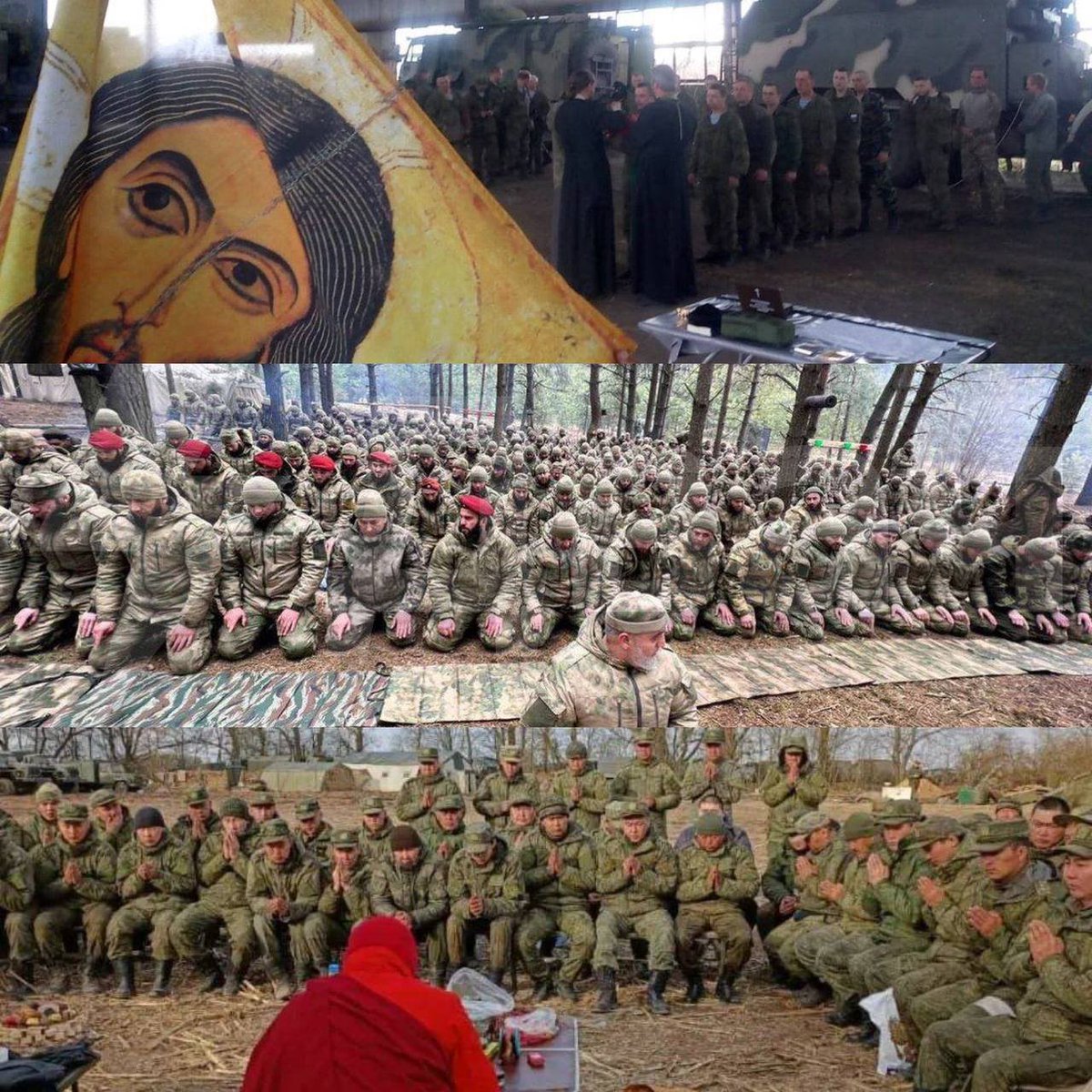 Acá una foto de unidades rusas con sus clérigos, muftis y monjes de campaña. La mayoría de Rusia es laica, pero depslegado hay tanto laicos, ortodoxos, musulmanes(tártaros,chechenos,dagestsnies, ingusetios etc) y budistas (buratios, kalmucos, tuvanos, etc)