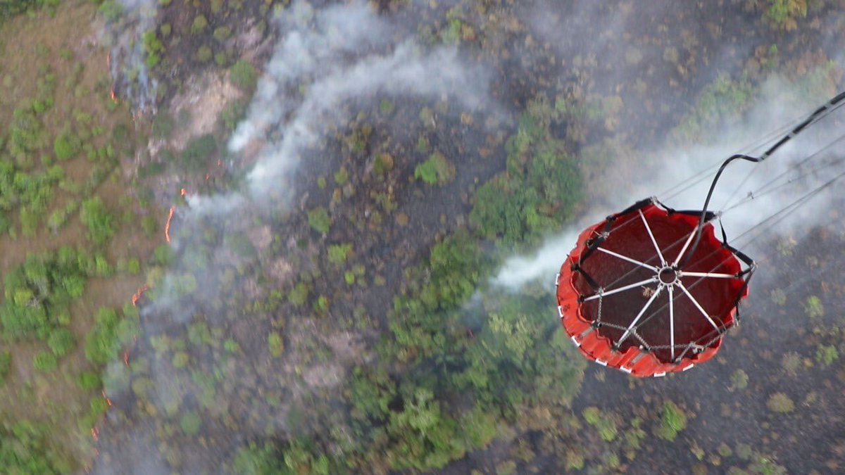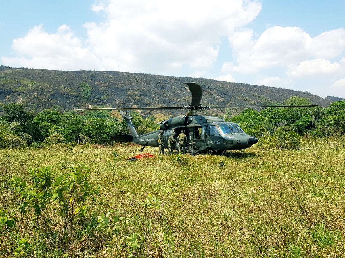 Con un helicóptero #BlackHawk del Comando Aéreo de Combate No.2, la @FuerzaAereaCol adelanta labores de extinción del incendio forestal en San Juan de Arama #Meta