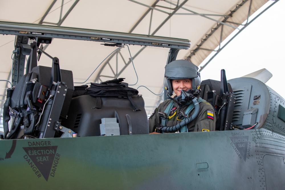 Piloto de Super Tucano del ESCOM 211 de copiloto en un AT-6E Wolverine en la Base Aérea Moody.