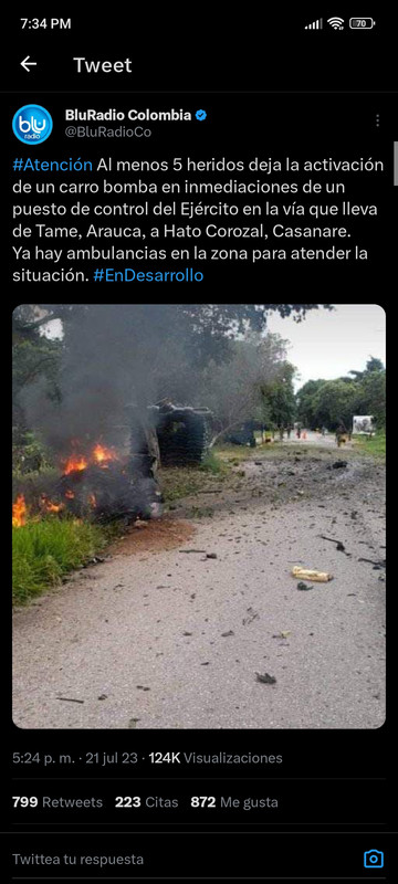 *Se presenta alteración de orden público en la vía Tame - Hato Corozal, al parecer un carro bomba  fue activado en el  retén de Naranjitos, se desconoce la afectación a población civil y fuerza pública que ejerce control en el lugar.*