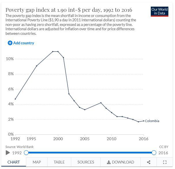 No estoy tan seguro de eso. Si bien nadie niega que existe un buen número de personas bajo la línea de misieria, su porcentaje no equivale a un gran porcentaje. De acuerdo con la información que comparto, el porcentaje de colombianos viviendo bajo la línea de miseria es del 1.8%. Lo interesante de este gráfico es la reducción significativa que hubo desde el 2000 al 2016. Ahora, seguramente la pandemia subió ese porcentaje, pero de nuevo insisto, el número de gente viviendo con menos de 1.9 USD al día es poca comparada con la población total del país.