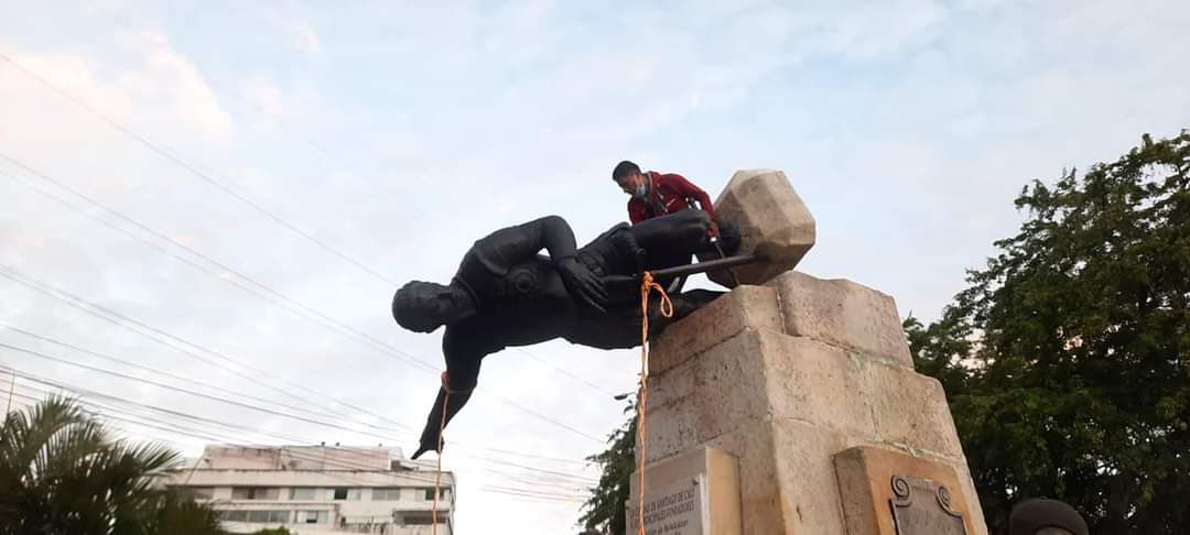 Acá las bellezas del paro, como era de esperarse, comenzaron con sus actos de vandalismo. Tumbaron la íconica estatua de Sebastián de Belalcazar, y también la agarraron contra los buses del Mio.