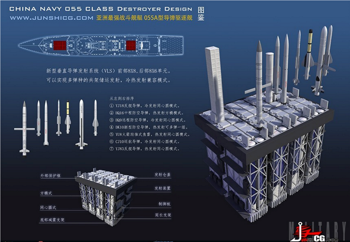 El VLS que utilizan los chinos es el HHQ-16 (Red Sea 16), que es la versión naval del HQ-16 que es un SAM terrestre y ese lanzador integra misiles de 34 cm de diámetro: