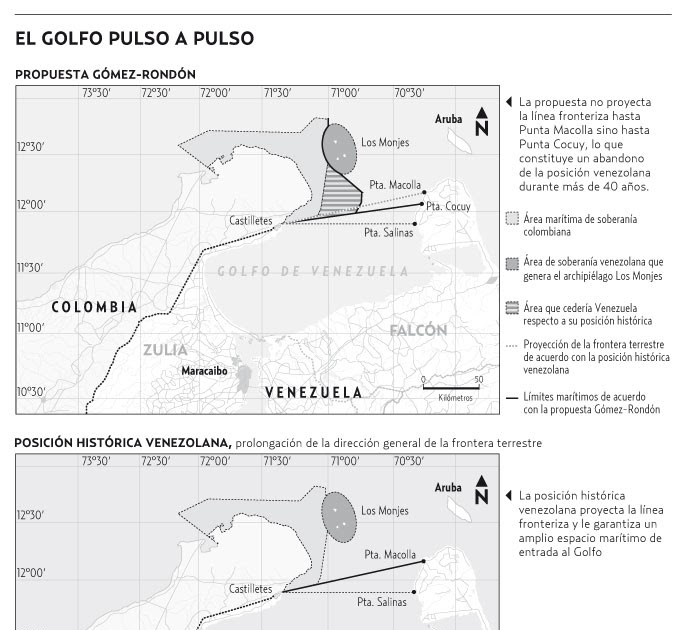 Y como dijo un forista: si el golfo, si todas esas aguas son suyas, ¿para qué carajos se ponen a convocar reuniones bilaterales, llamados a un acuerdo sobre esas aguas? ¿Al fin qué, sí son o no son? Si usted considera algo suyo, lo defiende a rajatabla, no se pone a convocar reuniones ni nada de eso. Eso sólo muestra que en realidad no son de ustedes, que hay otro en disputa y entienden que ese otro tiene derechos.