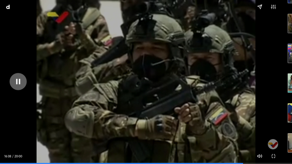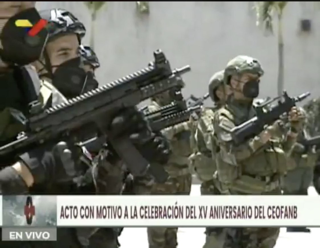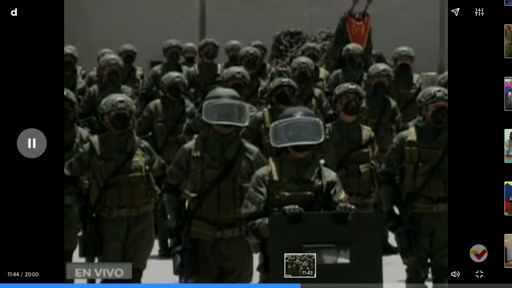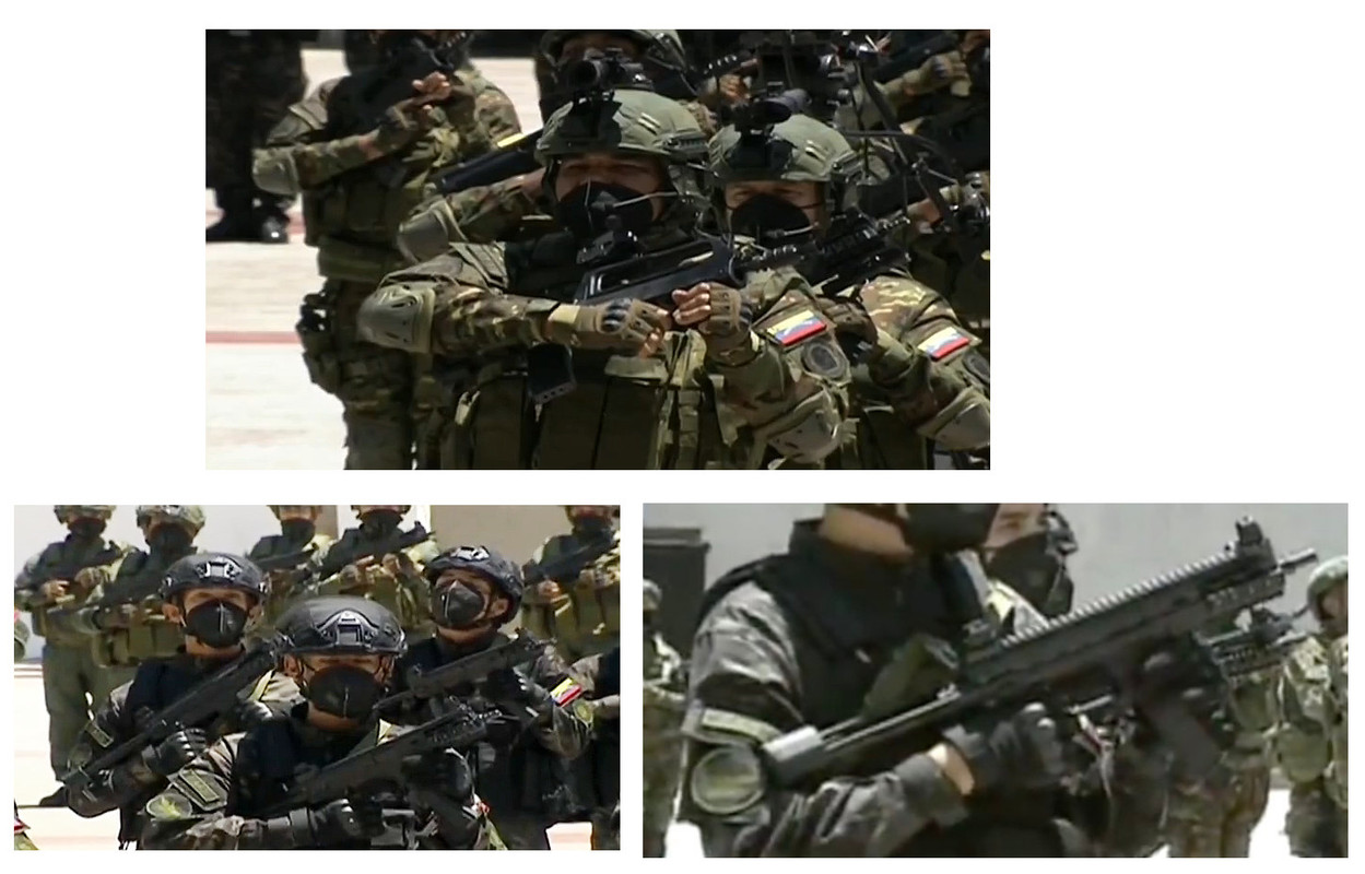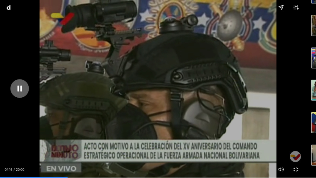 En esta imagen se logra apreciar bastante: - Cascos FAST nivel IIIA 3A en colores negro y verde. - Sistemas de Comunicaciones vía Radio con transmisor (Algo nuevo que nunca se había visto en la FANB hasta ayer) (Pero muy básico en muchas FFEE del mundo) - NVG de fabricación China que vienen a reemplazar a las antiguas NVG que se tenían desde hace más de 30 años.- - Protectores de Rodillas y Codos. - Chalecos con Placas de Cerámica. - Rifles de Asalto Bullpup QBZ-97 con Mira Holograficas HOLO de punto Rojo. (Algo que tampoco se tenía) - Subfusiles CS/LS-7: Subfusil CS/LS-7: Rifle de Asalto Bullpup QBZ-97: Además de dichas armas, llego un nuevo Lanzagranadas de 40mm NORINCO LG4 con Mira Holografica HOLO de punto Rojo. Vendría a reforzar los nuevos Mikor LGL ya operados desde hace unos meses: También se vieron 4 nuevos Rifles de Francontirador recientemente adquiridos. Los cuales solo puedo diferenciar uno debido a la calidad de la imagen. NORINCO NBR-13/NSG-50 de 12,7mm: También podemos apreciar una nueva arma basada en el CornerShot Israelí que es un dispositivo para disparar desde esquinas, permite al tirador disparar sin exponerse al fuego enemigo. Desde una Pantalla, pudiendo adaptar diferentes Pistolas. En la imagen de arriba, se logra ver el dispositivo, además de las Nuevas Mascaras Anti-Gas de Dotación, Binoculares, equipos de designación y un Casco con Visor Blindado. Además de los nuevos Cascos FAST nivel IIIA de Protección también se adquirieron Visores Blindados para integrarlos a los Cascos. Y algo súper importante que la FANB no había tomado en cuenta hasta ahora, era la comunicación individual entre los propios Operadores, vehículos y puestos de Comando, algo nulo hasta hace poco ya que ningún cuerpo de FFEE contaba con un equipo individual de comunicaciones como en cualquier FFEE del mundo. Se pensó por fin en eso y se esta equipando a las FFEE de estos equipos. Aquí se logra apreciar el sistema de comunicaciones junto a la NGV todo conectado al Casco FAST. Este será el nuevo equipo individual de cada Miembro de FFEE de la FANB. También se pudo apreciar los dos nuevos Camos para las FFEE en la FANB. El ya visto arriba y presentado hace algunos meses por Ceballos que vendría siendo un Multicam con los tonos del Woodland y el mismo pero en tonos negros y oscuros, parecido al Multicam Urbano original. En la imagen de arriba y esta de abajo se logra ver el patrón Multicam en colores oscuros. Siendo estos dos nuevos Camos, los estándar para las FFEE. Que por cierto, un año atrás había traído las fotos de cuando comenzó este proyecto (2019). Donde se ve todo el equipo mostrado ayer, más otros que no han mostrado, como lo son los Chalecos Tácticos completos para operaciones Urbanas, etc... Además del Multicam de arriba en tonos Grises. Aquí se logra apreciar el Multicam en mucha mejor calidad, además de los Cascos FAST, Chaleco Pesado de operaciones Urbanas y ligero, junto a las Mascaras Anti-Gas de nueva dotación: Aquí se ve el nuevo Camo estándar en mucha mejor calidad y a detalles. No puedo dejar de mencionar los nuevos equipos para salto HALO y las "Cajitas Negras" que llevan cada uno. Eso sin contar los Drones, Inhibidores y Sistemas de Guerra Electrónica que fue la mayor inversión. Pero no encuentro mucho sobre esto.