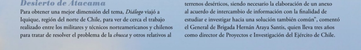 No es un terreno fácil. El altiplano, por su altura, afecta negativamente a la potencia y fiabilidad de los motores y tienen un polvo extremadamente fino denominado "chusca" que lo averia todo...los Leopard 2 chilenos tuvieron que ser "modificados" en Alemania para tratar de minimizar estos problemas, aunque es dificil evitarlos al 100%. Un saludo