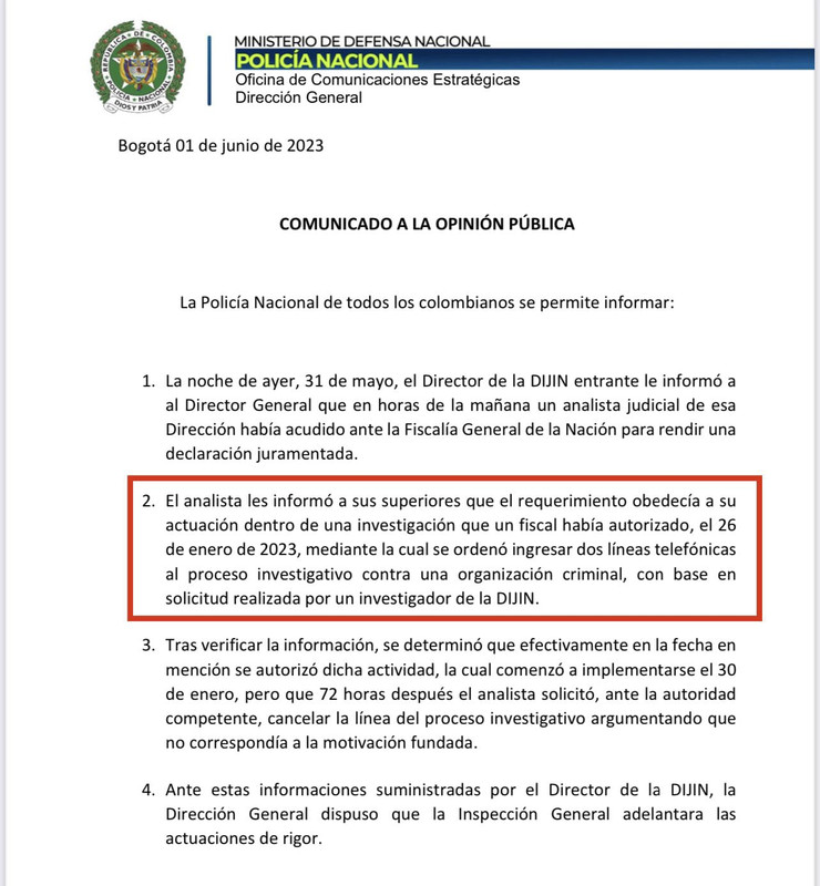 #Atención La Policía Nacional confirmó que un investigador de la Dijin sí pidió sumar dos líneas telefónicas a una investigación contra el Clan del Golfo, pero el proceso fue frenado 72 horas después. Esto, tras la denuncia de la Fiscalía de las chuzadas contra dos extrabajadoras de la jefe de gabinete Laura Sarabia https://twitter.com/BluRadioCo/status/1664401353857286147?t=agHRH3PImrP4x8lIqsfbsQ&s=19