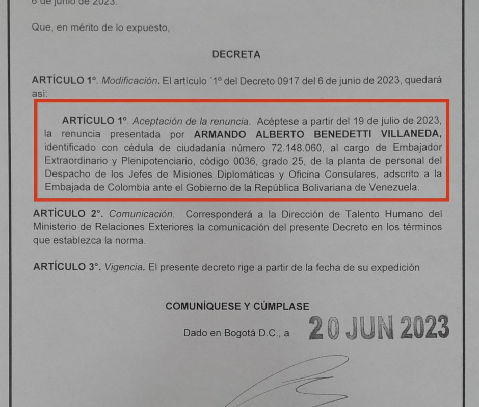 URGENTE — Petro mantiene a Armando Benedetti como embajador en Venezuela hasta el 19 de julio