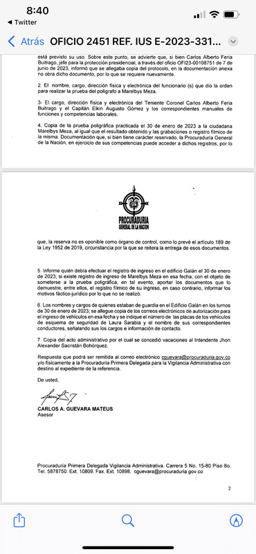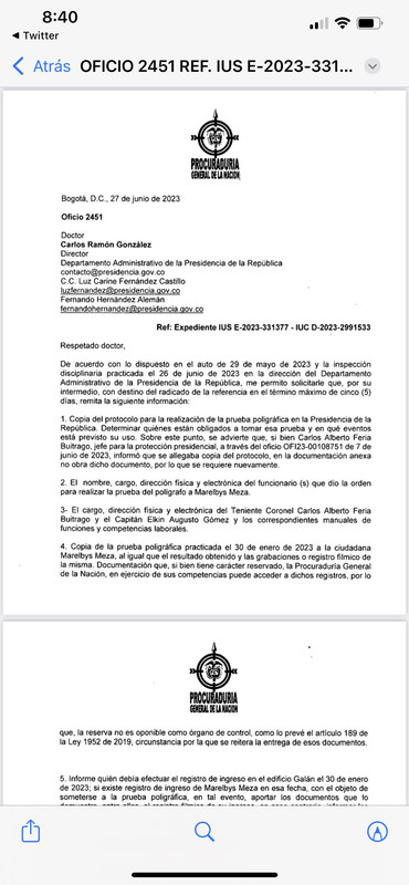 La procuraduría le envía este oficio al director del DAPRE pidiendole que en un plazo de 5 días le envíen esta información (caso Laura Sarabia y polígrafo)