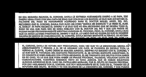 El joven abogado cuenta cómo fue allí que el coronel hizo el pago de parte de los honorarios de Del Río con la mayor discreción posible. “Mi papá y yo nos sentamos en la parte de atrás de la camioneta y el coronel Dávila se sentó en la silla del copiloto. El coronel Dávila le entregó un sobre a mi papá que contenía dinero y le dijo que ese era un adelanto del acuerdo al que habían llegado con el doctor Del Río”, asegura, pero aclara que desconoce el monto del dinero. Esta negociación habría tenido lugar un día antes, cuando se reunieron el abogado Del Río, Tocarruncho y Wadit Velásquez.