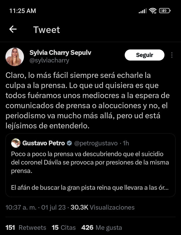 A ver, Pepe. El problema es que la periodista Sylvia Charry de la Revista Cambio fue acusada por Petro de haber provocado el suicidio del Coronel Dávila. ¿Capta?