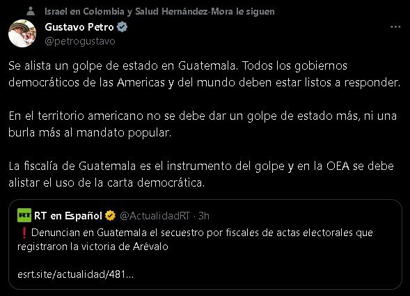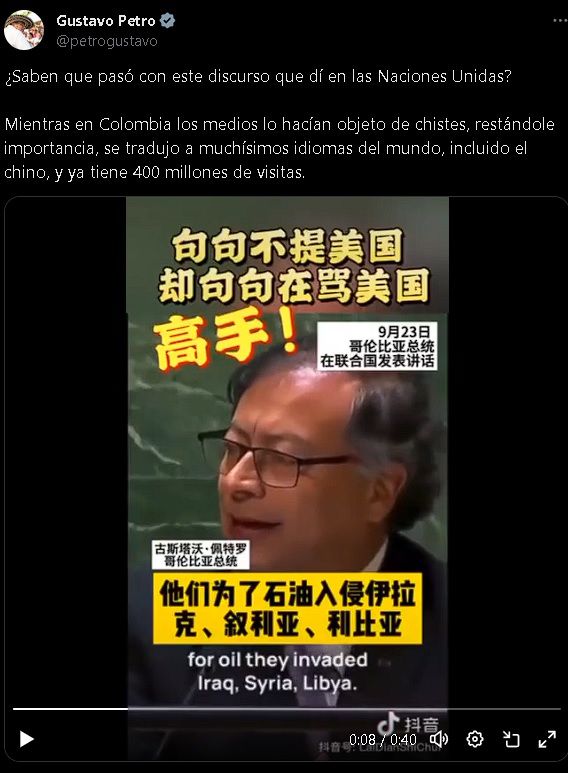 Habla de democracia y golpes de Estado, cuando hace unas horas habló abiertamente de censura de los medios en Colombia, Incluso maravillado por un video en China de su fallido discurso en la ONU donde dice tiene "400 millones de vistas", obviando el tema de inflación de interacciones muy común allá. Yo veo cada vez a un petro más errático y una oposición bien tímida y que no se preocupa por juntar esfuerzos.