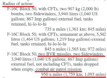 La otra correcion va en el sentido de que el radio de combate normal del F-16 es de apenas 340 mn y no 500 mn.