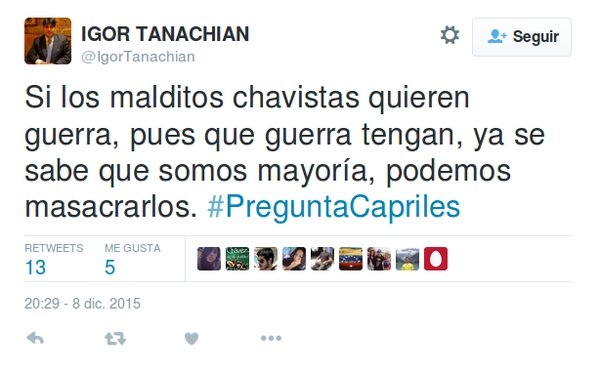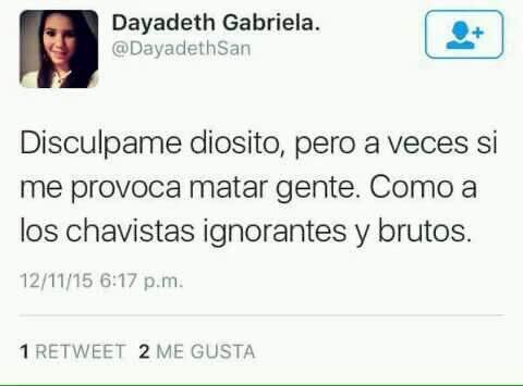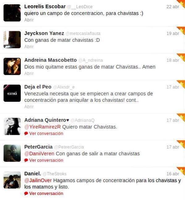 Metes la frase matar chavistas en twitter y te encuentras un patrón común en la oposición, lo dicen, que de ser poder a matar al vecino, al amigo, al familiar que sea chavista